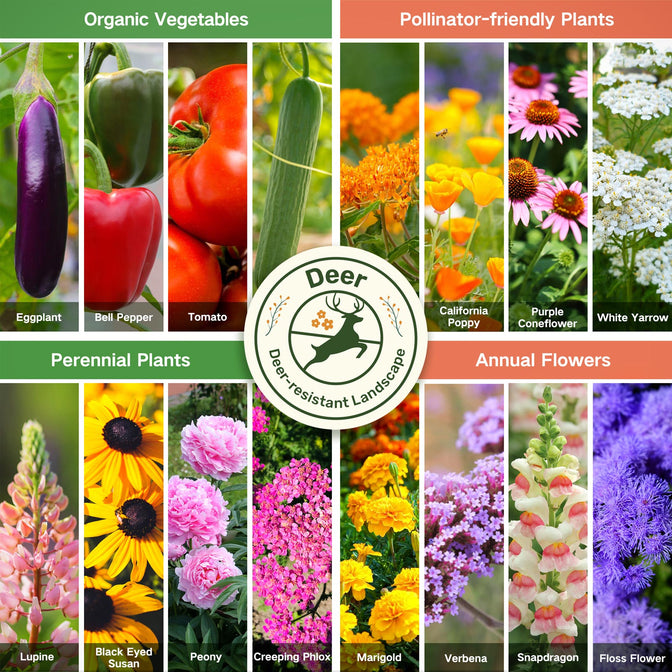 All-in-One Deer-Resistant Garden Seed Bank - The ultimate solution for creating a lush, vibrant garden sanctuary that is naturally protected from deer browsing. This seed bank features 16 carefully selected deer-proof seed varieties, allowing you to grow a thriving garden without having to worry about unwelcome visitors. Experience the joy of gardening without the constant battle with hungry deer and have fun in an unspoiled and undisturbed outdoor space.