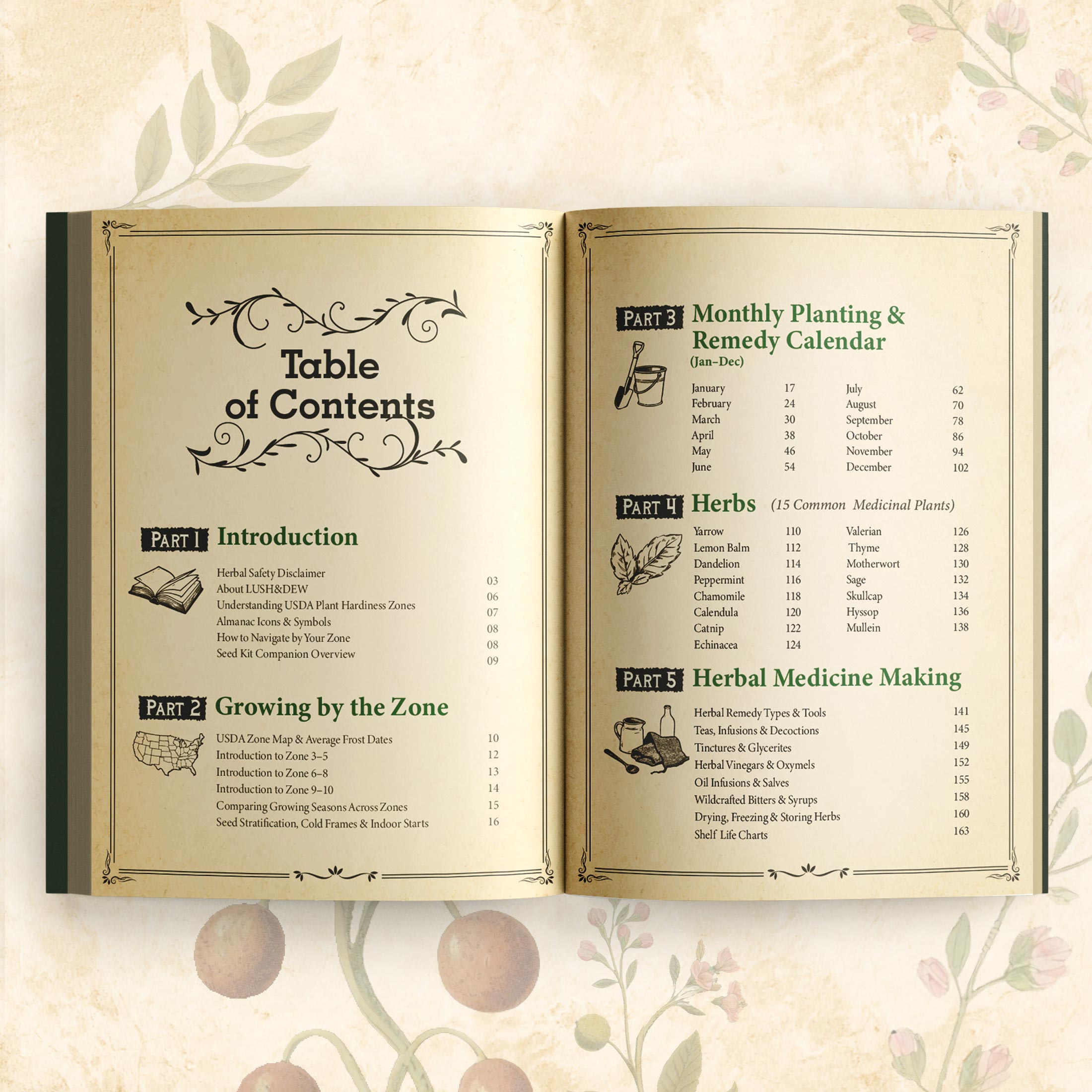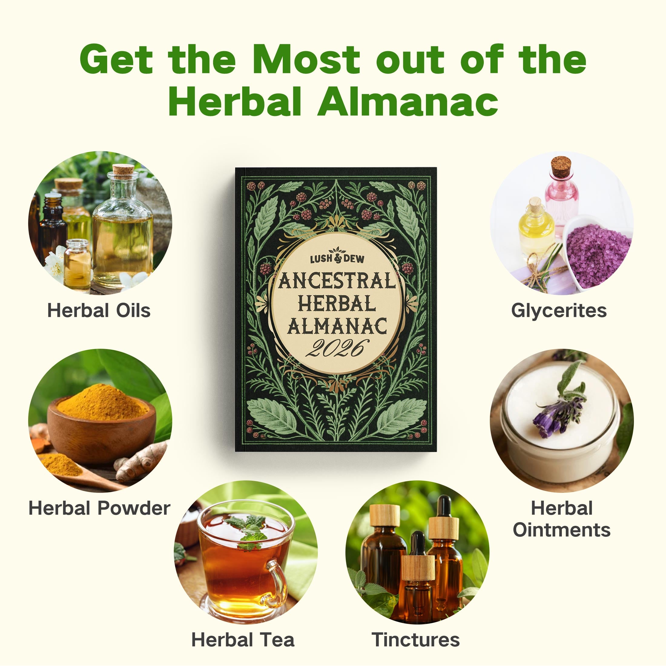 The Ancestral Herbal Almanac 2026 is designed to accompany the LUSH&DEW Ancestral Herbal Seed Chest (40 Medicinal Herbs), this annual almanac is a practical and spiritual guide for herbal gardeners & home apothecaries. With zone-adaptability from USDA 3 through 10, it bridges traditional wisdom with modern gardening, offering clear monthly guidance, remedies, and reflections to carry you through the seasons.
