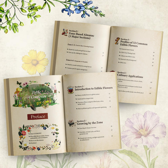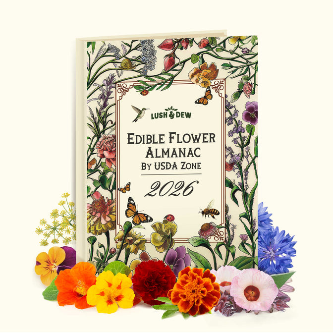 Designed to accompany theĀ LUSH&DEW Edible Flower Seed Bank, this almanac is a creative and practical guide for gardeners, home chefs and floral enthusiasts. With zone-adaptability from USDA 3 through 11, it blends culinary knowledge with modern gardening guidance ā offering clear monthly planting tips, harvest notes, preservation techniques, and seasonal cooking inspiration to carry you through the year.