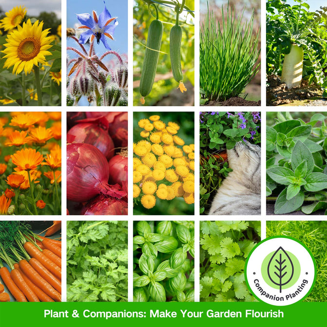 Full Companion Plants Seed Bank - Experience the joy of nurturing a thriving and harmonious garden. Carefully curated to cater to enhance the growth and vitality of your garden. This exceptional collection includes 32 different seeds, each thoughtfully selected to complement eight species: peppers, potatoes, radishes, tomatoes, lettuce, corn, onions, and pumpkins. Embrace the wonders of companion planting and witness your garden thrive like never before.